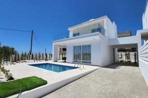 This brand-new, luxurious villa offers three bedrooms, a private pool and garden, and views of the sea.